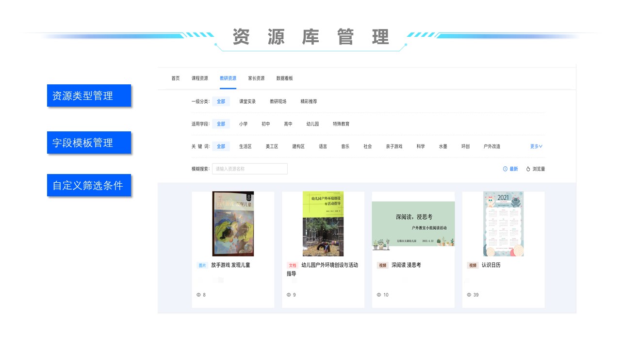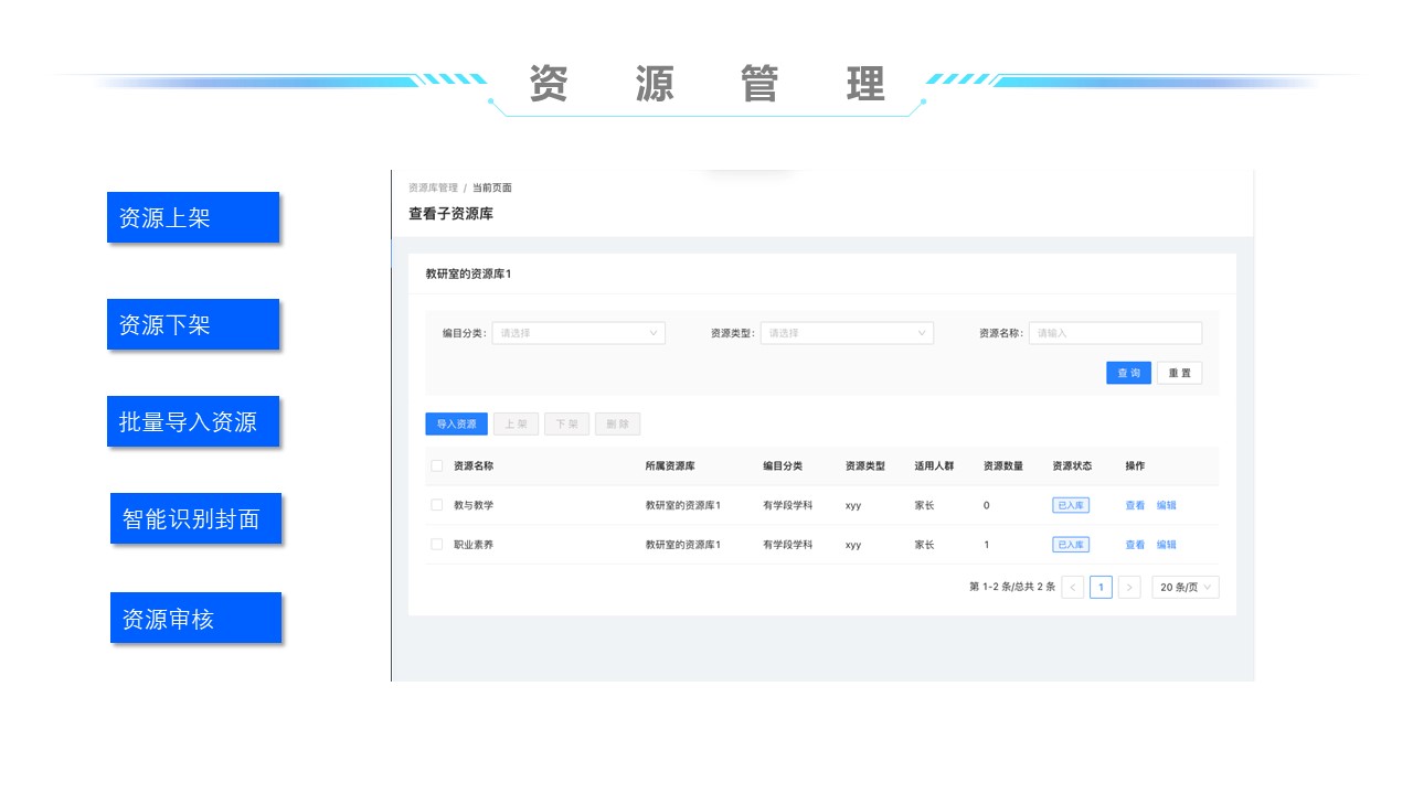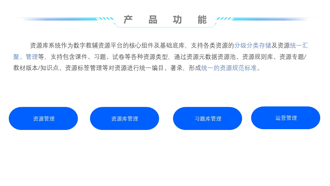 资源库系统是生产、、编目、、、、储存、、管理和分发资源的核心载体。。构建内容资源元数据采集及管理工具、、、标准化的数字资源生成、、转换、、、、存储、、、调用工具、、标准的数字教育资源管理体系、、资源审核、、、、评价、、、、调用体系。。