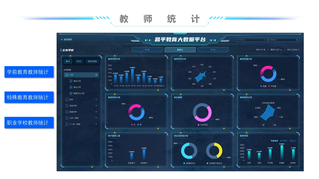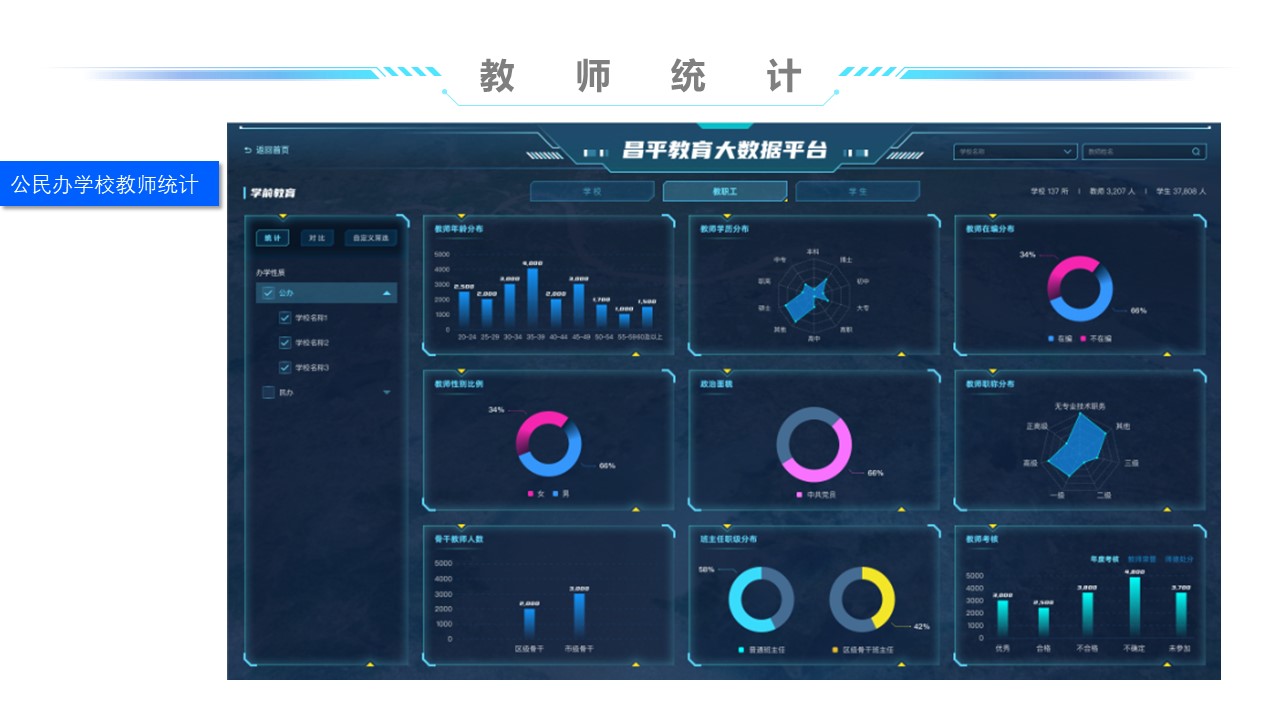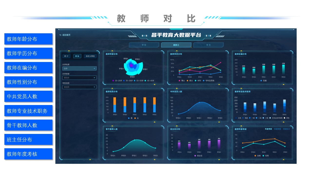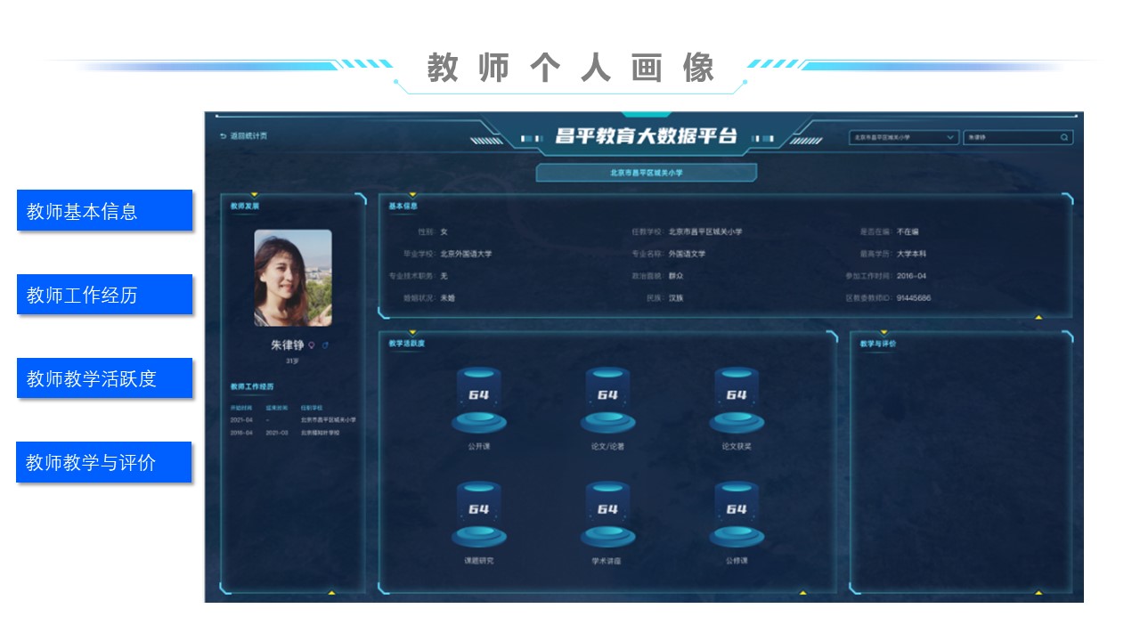 教师画像通过对应用系统数据的获取,,收集教师的教学能力、、教育能力、、、、教研能力、、、工作态度、、、、工作业绩、、、教学效果、、科研效果等方面的数据,,,,为教师的考评及发展提供数据支持。。