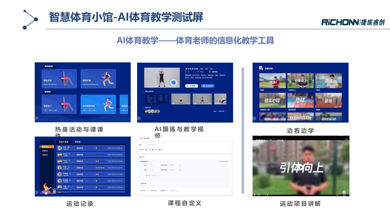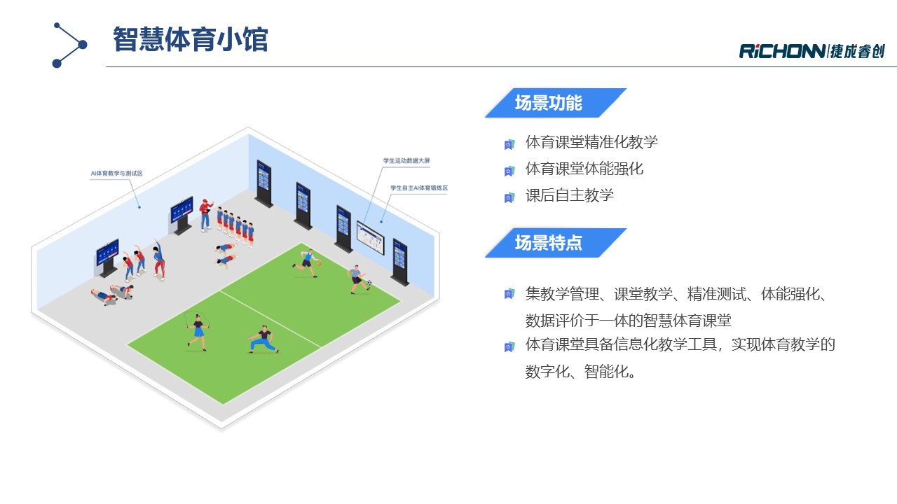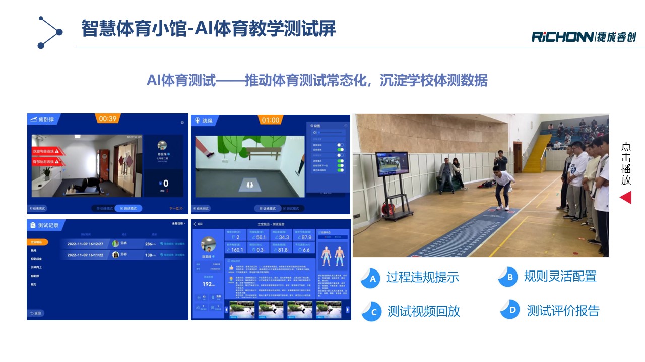 智慧体育小馆通过多种AI体育锻炼及测试设备构建体育实训室,,,,旨在提升校园运动氛围培养学生运动兴趣,,,围绕运动能力发展建立智能评测体系,,同时培育专业教师队伍,,,增强教学综合能力。。。。